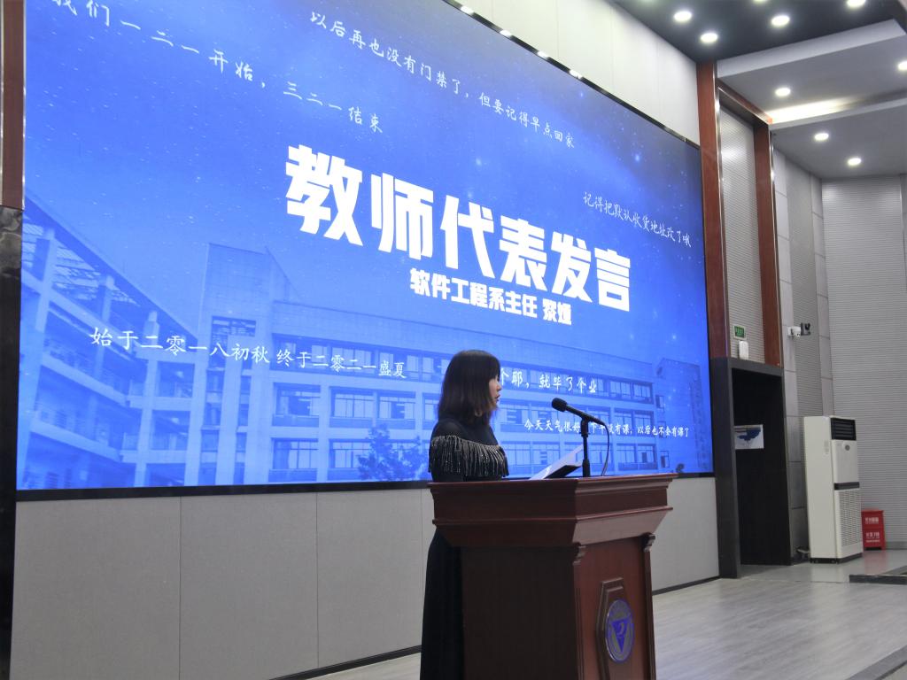 而后,教师代表软件工程系主任黎娅老师,优秀毕业生代表、信安1804班熊磊同学进行了发言,他们对毕业生员工这样说道:“不论日后身在何处,立于何方,都要时刻铭记‘厚德强能,求实创新’的校训,‘笑诚担赞谦,团拒礼感歉’的学院文化箴言,走到哪,都要做一个以诚待人、踏实工作、自信自强、创新立业的‘重电智数人’。”
