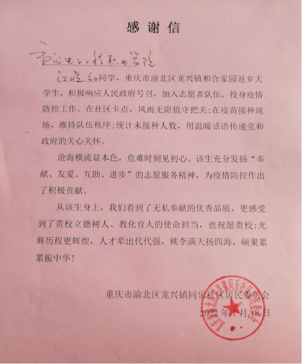 在志愿服务活动结束后,江晓红同学也收到了重庆市渝北区龙兴镇和合家园同乐社区寄来的一封感谢信。江晓红同学积极参加公司活动,加入志愿者队伍,投身疫情防控队伍中,认真落实习近平总书记关于青年工作的重要思想,坚持“受教育、长才干、作贡献”宗旨的生动展现。希望更多的学子在接下来寒假“返家乡”活动中,能够真正做到乐于奉献,以实际行动展现新时代青年的责任和担当。