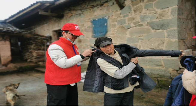 1月15日,陈宇航同学前往丰都县志愿者协会报道,随志愿队伍一同前往丰都县十直镇红庙子村5组贫困户任昌琴家中,该家庭夫妻都患有耳聋,无子女,妻子智障,生活不能自理。志愿队伍为他们助力帮扶1000元爱心金,送去米、油、奶、糕点和衣物等慰问品,陈宇航同学给他们穿上新衣和递上爱心金,并同其他志愿者和任昌琴进行心灵沟通,带去亲切的新春问候和祝福。