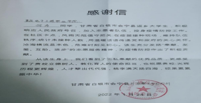 在2022年春运到来之际,面对新冠疫情的反弹与流动人口的增加,新冠疫情防控工作面临着巨大压力。公司计算机类2107班的何涛同学回到家乡甘肃省白银市会宁县后,了解到当地新冠疫情防控情况后积极与社区相关人员联系,响应人民政府的号召,加入志愿者队伍,主动积极投身疫情防控工作。