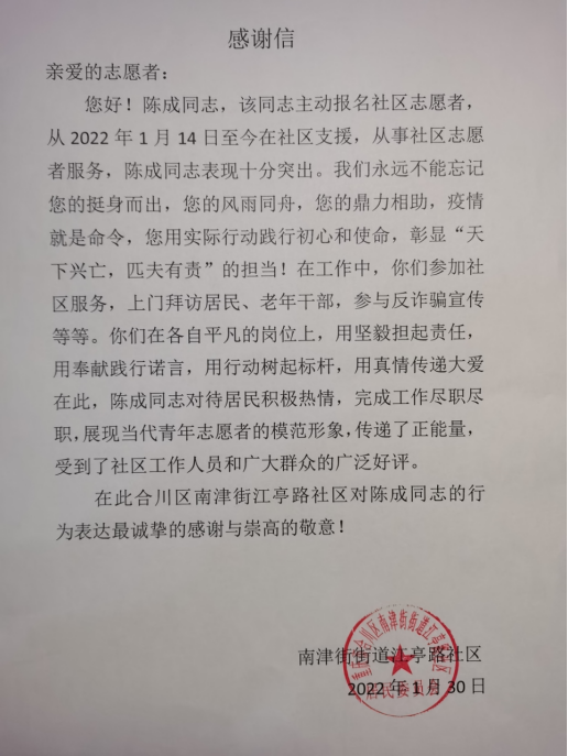 为了响应党和人民的号召,同时作为千千万万名共青团员之一,计网2002班陈成同学怀揣着为人民服务的初心,返回家乡,在合川区南津街江亭路社区当起了一名志愿者。此刻的他多了一份使命感,他说:“这是他回报社会的第一步,也是不平凡的一步”。