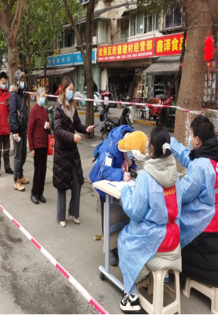 疫情并未结束,对于要离开成都去其他地方的和从其他地方来成都的,都需要做核酸检测,刘梦路同学也积极参与到了社区免费核酸检测中,在登记信息处登记进行核酸检测人员信息,在人员较多时组织维护秩序。“常常是在户外一坐就是一天,风吹雨打也会一直守着,没人时还要拿着喇叭去商铺、街道、院子里宣传,有时还会边走边进行核酸检测”。