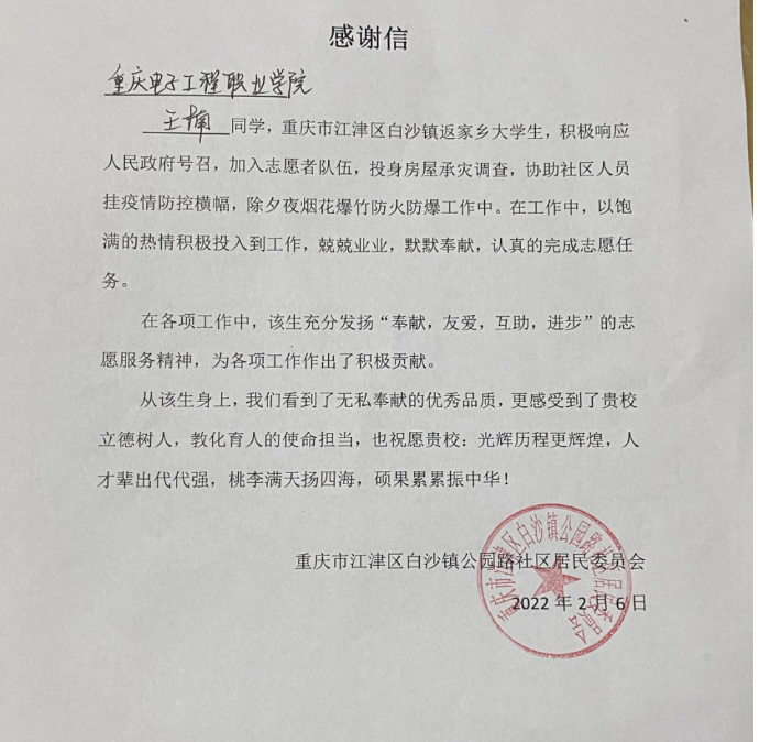 最后,在社区姐姐以及每个社区工作者的热情协助下,王楠同学完成了此次的志愿活动并收到了社区的感谢信。王楠同学在获得感谢信后回复到:“我明白所有的收获都是来之不易的,不只是友情,还有对未来满怀憧憬的心。谢谢社区给我这次美妙的人生体验。”