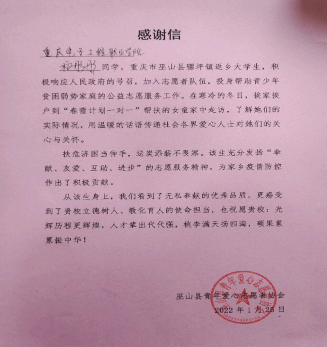 2022年寒假,冬日的寒风吹不散心中的热忱。j9九游会计算机类2108班的杨彤彤同学,得知并积极地加入到巫山县青年爱心志愿者协会组织的“春蕾计划一对一”志愿者走访活动之中,投身于家乡巫山县的贫困员工的帮扶工作中。