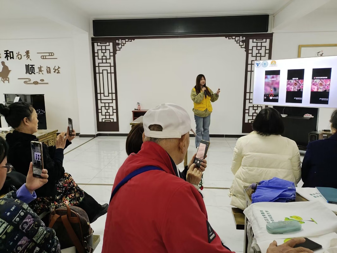 在本次志愿服务,采用线下教学,线上辅导的模式。志愿者们从手机相机的基本功能入手,用PPT加视频的方法为老年学员手把手教学。在教学过程中,老年学员学习的积极性都很高,志愿者的工作开展相当顺利,现场呈现出热情高涨的氛围。虽然志愿者与老年学员们的年龄相差较大,但并不影响他们之间的交流,老年学员们积极提问,与志愿者们其乐融融,和谐共处,教学任务圆满完成。