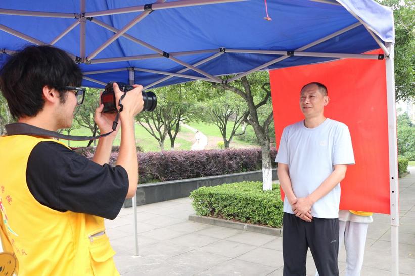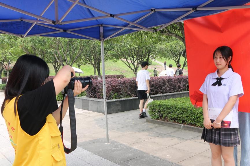 另一边最美证件照拍摄,志愿者为需要图像采集的同学以及老师拍摄证件照并让其扫码加群,方便在活动结束后志愿者将原件发给同学们。
