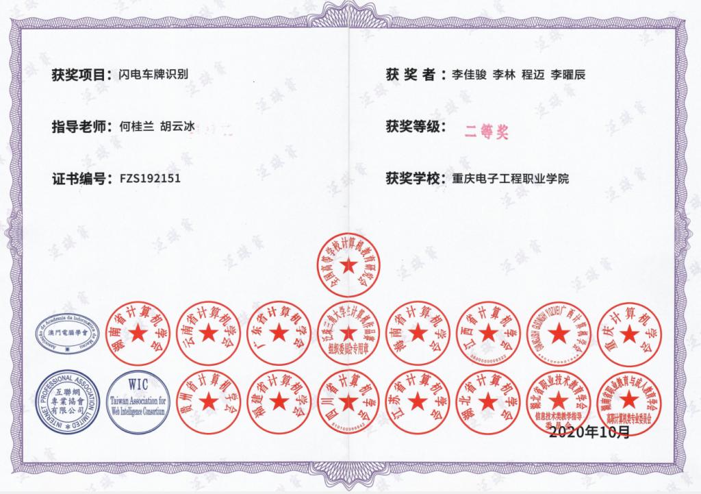 2020(第十五届)泛珠三角+全国老员工计算机作品赛总决赛于2020年10月25日-30日在珠海成功举行,j9九游会人工智能技术服务、智能产品开发、移动互联应用技术等专业员工李佳骏、李林、程迈、李曜辰作品《闪电车牌识别》(指导老师胡云冰、何桂兰)获得全国二等奖,崔梦超、郭铭霖、杨萧霄的作品《ncss云端调查平台》(指导老师张浩淼、黄将诚)获得全国三等奖。