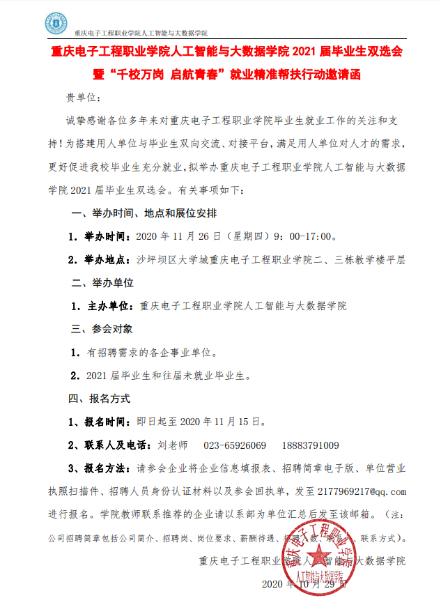 上一条:2020年下半年计算机技术与软件专业技术资格(水平)考试 重庆电子工程职业学院考点工作圆满成功 下一条:重庆电子工程职业学院-加拿大卡纳多文理学院合作办学2020级新生开学典礼