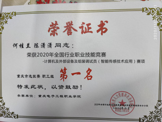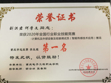11月14日,重庆市人力资源和社会保障局传来好消息,公司人工智能技术服务、智能产品开发、移动互联应用技术等专业师生在2020年10月18日在重庆电子工程职业学院举行的2020年全国行业职业技能竞赛“计算机及外部设备装配调试员(智能传感器技术应用)”赛项重庆市选拔赛中取得佳绩。