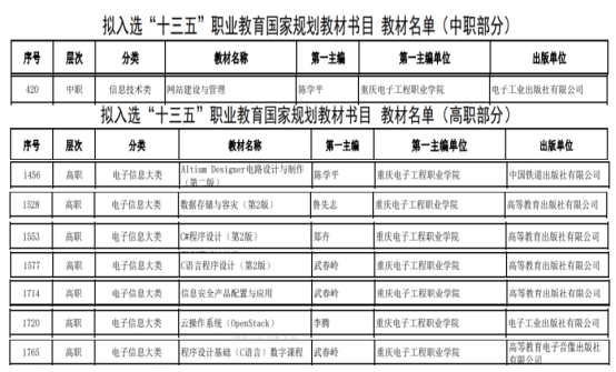 近日,教育部发布拟入选“十三五”职业教育国家规划教材书目教材名单,经单位申报、形式审查、网络和会议评审等程序,j9九游会武春岭教授等主编的《信息安全产品配置与应用》《C语言程序设计(第二版)》等8本教材拟入选“十三五”职业教育国家规划教材书目。