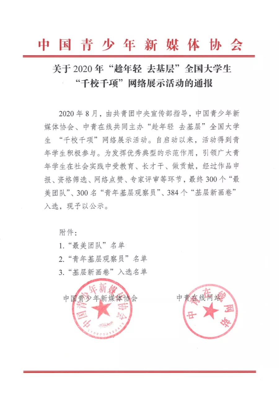 2020年8月,由共青团中央宣传部指导,中国青少年新媒体协会、中青在线共同主办了“趁年轻去基层”全国老员工“千校千项”网络展示活动。为发挥典型的示范作用,引领广大青年员工在社会实践中受教育、长才干、做贡献,经过作品申报、资格筛选、网络点赞、专家评审等环节,学校j9九游会“小我大爱”向日葵社会服务志愿团成功入选全国300个“最美团队”,计算机类1902班李迅同学入围300名“青年基层观察员”名单。这是继学院团总支书记黄婧雯获2019年大中专员工“三下乡”暑期社会实践“千校千项”优秀实践者称号后智数学院又再获全国“千校千项”荣誉。